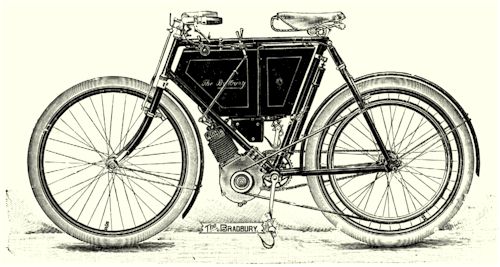 Bradbury & Co., Wellington Works, Oldham, were well known in veteran days for building some very sturdy motorcycles with a rather extraordinary feature: the crankcase of the motor was brazed into the frame! This feature dates back to the early days of the company's motorcycles, but not back to the absolute beginning. The first Bradbury motorcycle advertisement I have seen appeared in The Cycle Trader on 10th January 1902.