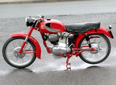 Although his desire was to produce motorcycles bearing his name, Morini initially concentrated on the production of light three wheeled commercial vehicles and following Italy's entry into the Second World War, the manufacture of aircraft components. With the end of hostilities Morini was finally able to introduce a motorcycle of his manufacture, which was announced in 1946. The new machine drew its inspiration from the pre-war DKW RT series and layed the foundations for Moto Morini's success as a manufacturer of road machines and in racing. It was followed in 1952 by a 175cc four stroke single featuring overhead valve operation and a four speed gearbox built in unit with the engine with a typically Italian deep sump. Housed in a frame equipped with telescopic front forks and a pivoted fork rear end the new model reflected contemporary Italian styling and proved to be a steady source of income for the company, it also provided the basis for a series of increasingly quick derivatives that culminated in the Settebello.
