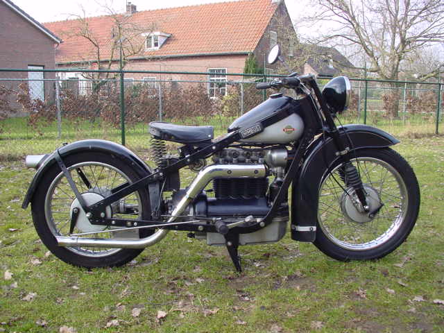 The Nimbus was manufactured by the firm of Fisker & Nielsen of Copenhagen. This company was formed in 1905 to manufacture electric motors; in 1910 the Nilfisk electric vacuum cleaner was marketed. This product was a great success and it was soon sold in many countries all over the world. In 1919 the first Nimbus four motorcycle was brought out. It was a remarkable design, since no steel tubing was used in the frame. Instead flat steel strips were used with the long, cylindrical petrol tank welded in place. Front and rear springing were available. This remarkable design was soon dubbed the stove pipe because of the distinct shape of the petrol tank. In 1928 the firm was no longer able to cope with the large scale production of both motorcycles and vacuum cleaners, so it was decided to stop motorcycle production, after some 1,300 machines had been made. This decision was soon regretted: in 1934 a new building was commissioned and the Nimbus II was brought out in April of that year. The flat steel strip frame was a feature in common with the stove pipe, but most other features were totally new: the top half of the crankcase was cast in one piece with the ribbed air cooled cylinder block. The iron cylinder head sported an overhead camshaft. The crankshaft drove the overhead camshaft through the upright mounted dynamo via sets of bevel gears. 12,715 were produced between 1934 and 1959.