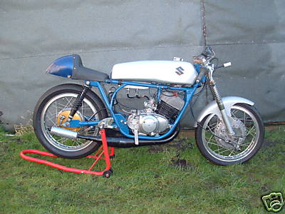 Suzuki Super Six Racer This example of the Suzuki T20 Super Six has been converted for racing and is presented in blue and silver and fitted with a large alloy fuel tank, rear-sets, ace bars, a full fairing, expansion chambers and a racing single seat. The twin leading shoe front brake is laced to unidentified alloy rim, the rear alloy rim being an Akront item.